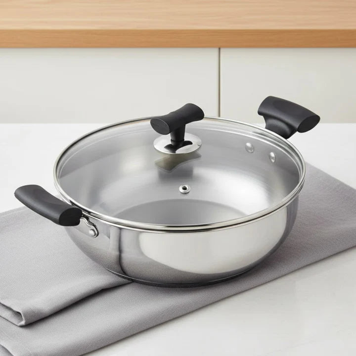 DONIV Cookware Sandwich Bottom Solitaire Kadhai is specially made with high-grade stainless steel along with a sandwich bottom to prevent burnt food. Mix, stir and braise the food smoothly with cool-touch handles and Glass lid with exceptional qualities and features. This kadhai is perfect for every occasion.