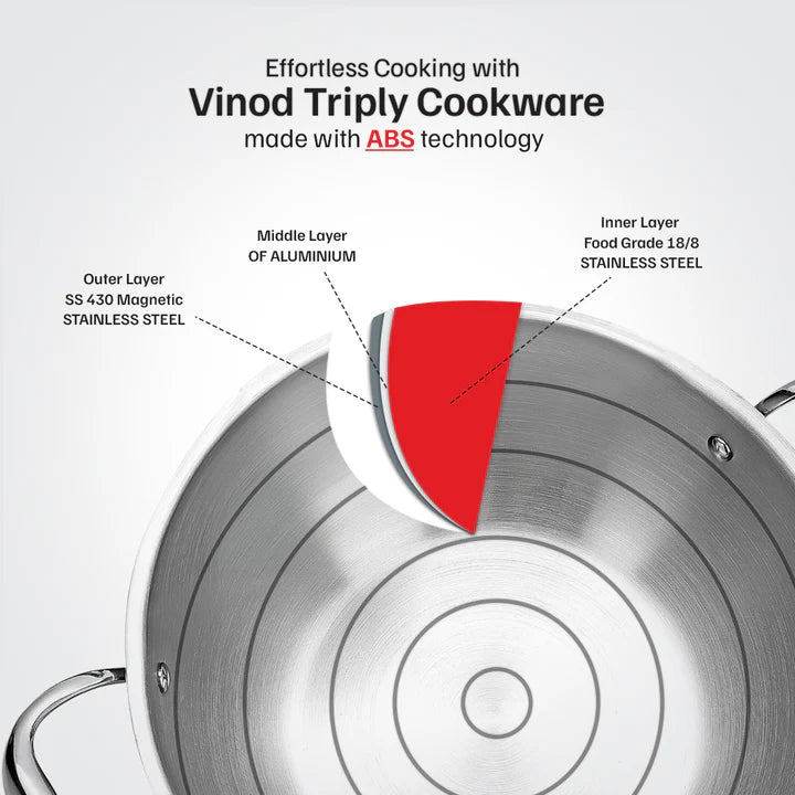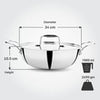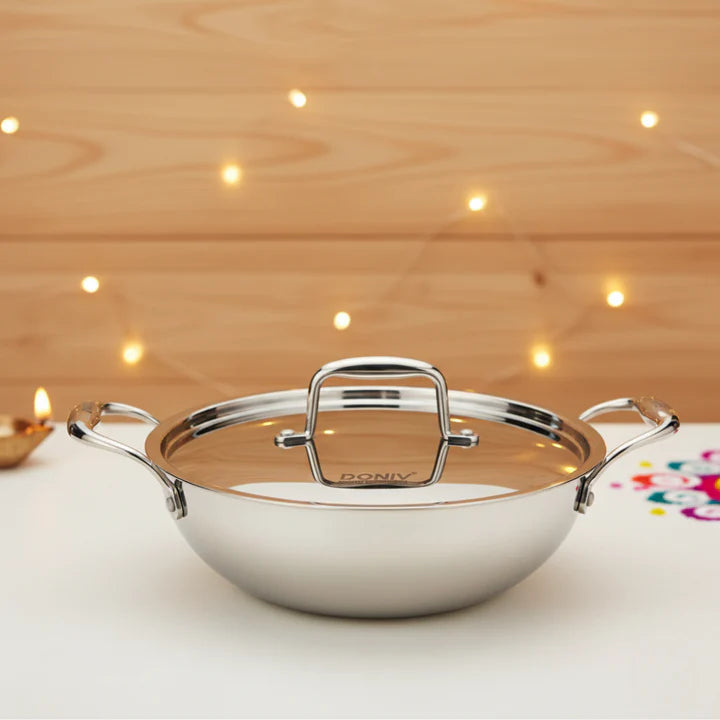 Doniv Titanium Triply Kadahi with Cover inner layer is made of Food Grade Stainless Steel (SS304), middle layer is aluminium for energy efficiency & quick, uniform heat distribution. Outer (SS430) makes it compatible on gas & induction for modern day cooking. What more one requires than a Smart Cookware from DONIV !!