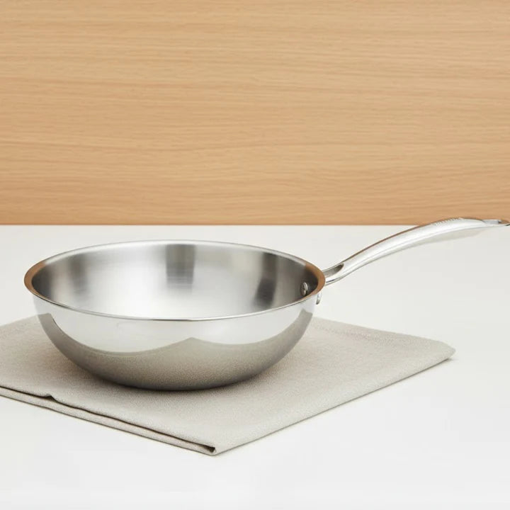 Doniv Titanium Triply Wok inner layer is made of Food Grade Stainless Steel (SS304), middle layer is aluminium for energy efficiency & quick, uniform heat distribution. Outer (SS430) makes it compatible on gas & induction for modern day cooking. What more one requires than a Smart Cookware from Doniv !!