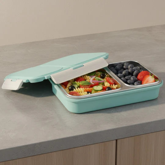 To ensure freshness and safety during movement, the Go Tiffin features an airtight silicone-sealed lid along with secure side clips. This airtight construction helps prevent spills and leakages while keeping food fresh for longer periods. The compact and lightweight design allows the tiffin to fit easily into backpacks, handbags, or lunch bags, making it convenient for daily commuting. The removable stainless steel tray and plastic lid are easy to clean, allowing quick washing and hassle-free maintenance after use, making it suitable as a steel lunch box for office and a lunch box for school.